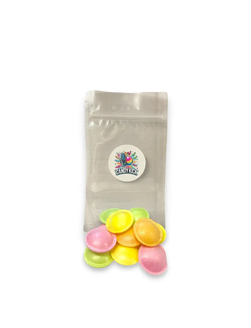 Ingrediënten: suiker, maiszetmeel, water, dextrose, voedingszuur (E334), zuurteregelaar (E500), aroma's, kleurstoffen (E100, E132, E162).
